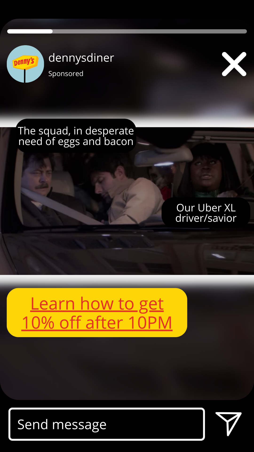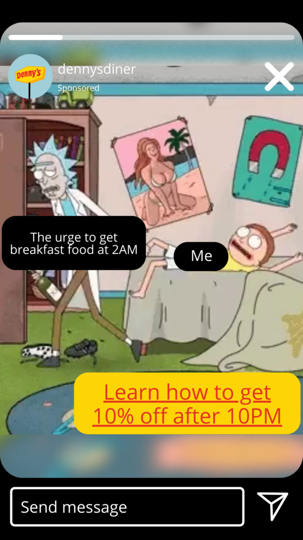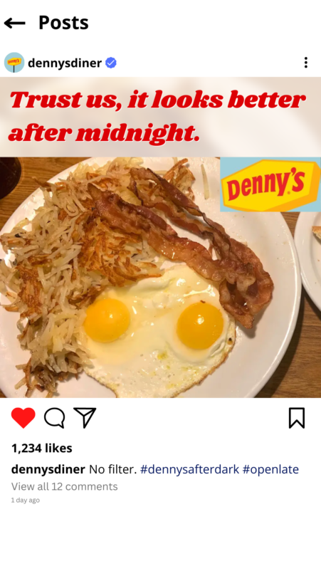 Sometimes you just need breakfast food. But that craving doesn’t always come at in the morning. Often, it hits late at night. How does Denny’s reach potential customers when they need eggs and sausage the most? With Denny’s After Dark. A welcoming environment with warm food at a discounted price. The campaign leverages social media to put promotional content in front of followers that resonates with their mindset. Late night Instagram posts and stories aim to drive diners to in-store dining. Meanwhile, a partnership with Uber incentivizes responsible decisions. Denny’s won’t ask why you’re ordering Grand Slam at 12:30 a.m., but they will bring it to you.