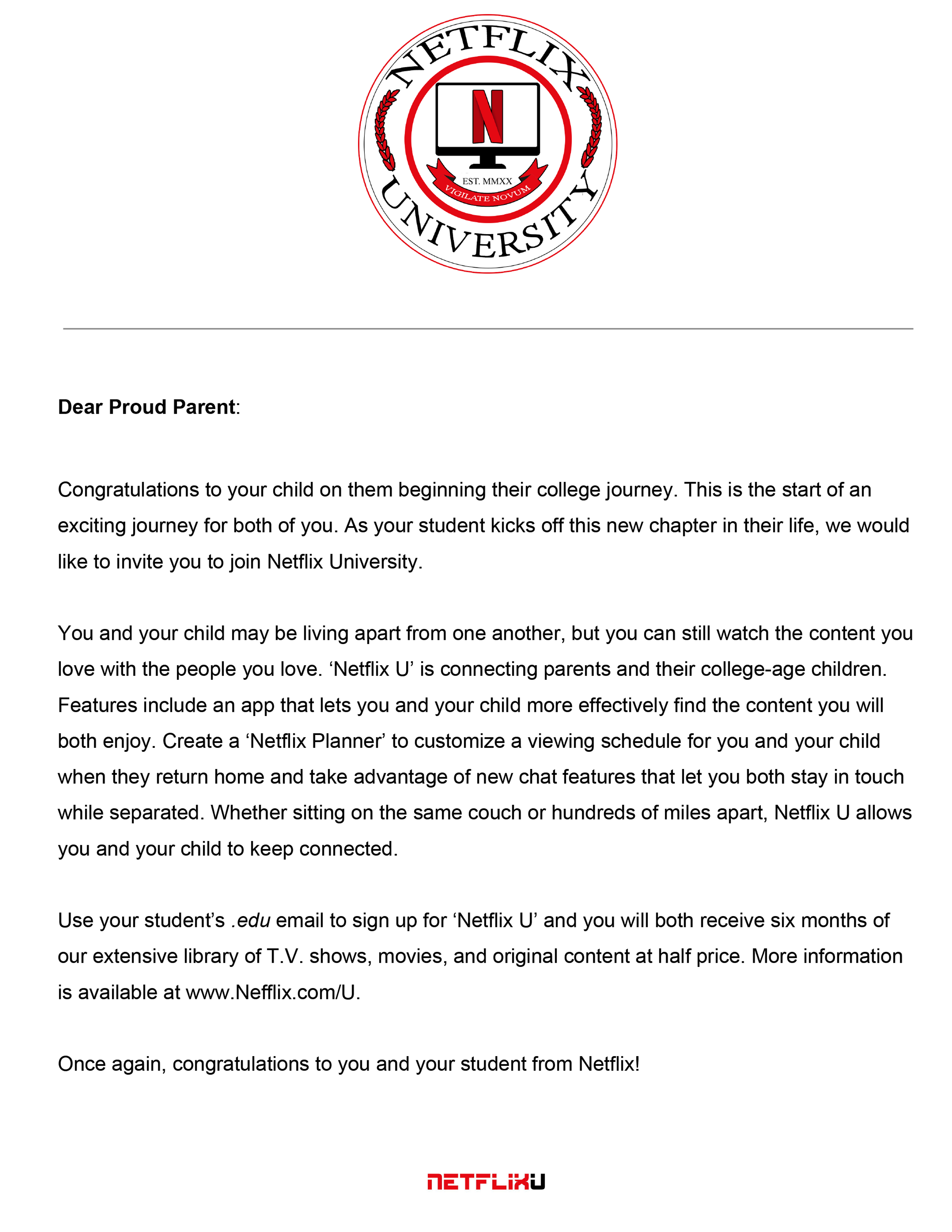 Every college freshman knows orientation is a time to receive bundles of branded merchandise. Netflix has something for parents and students.